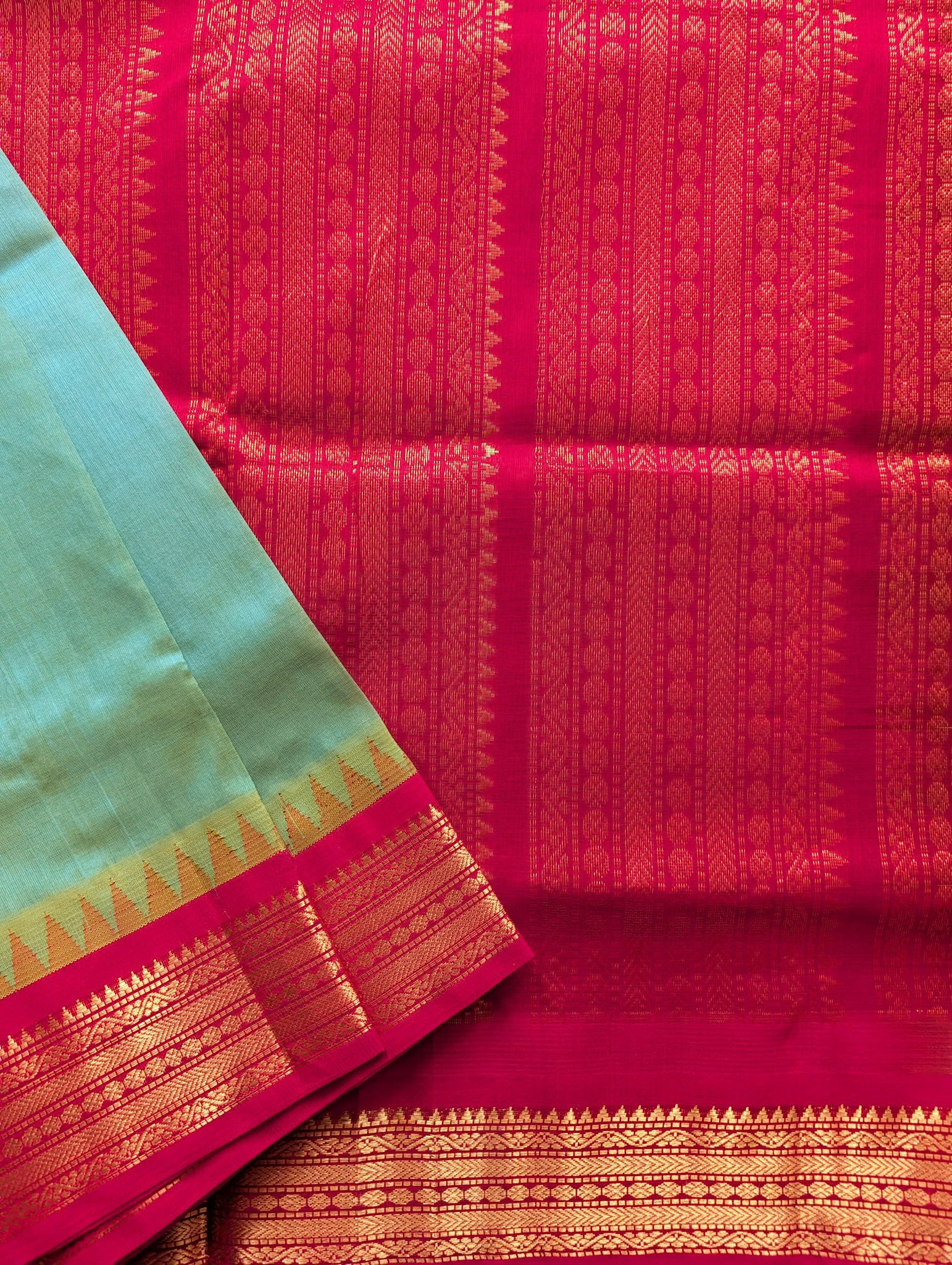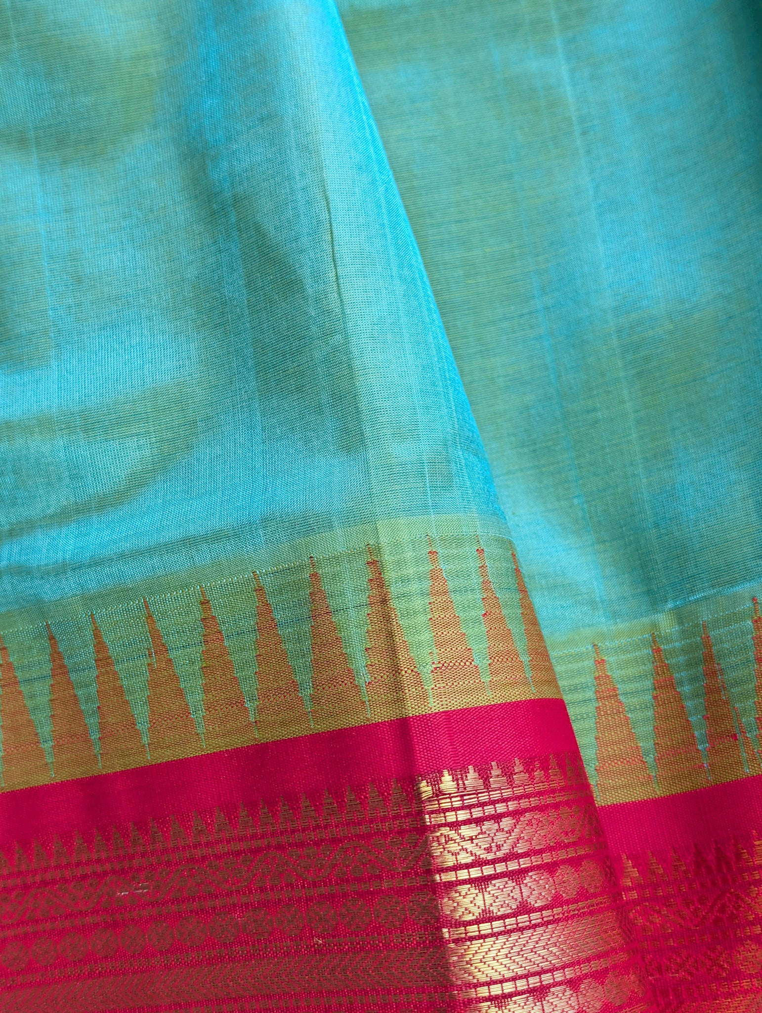Blue with Red Temple border Pure Kanchi Silk Cotton Saree