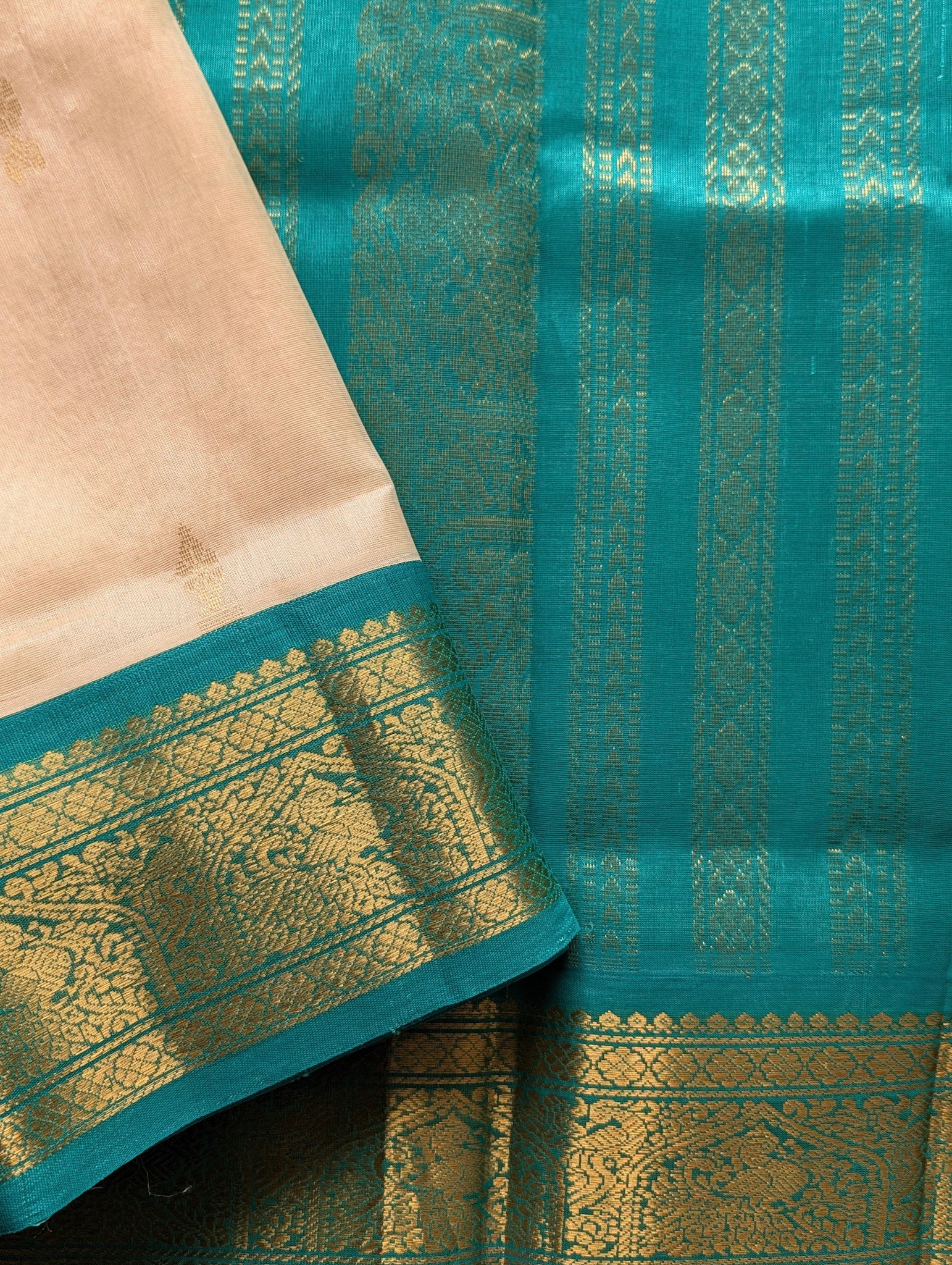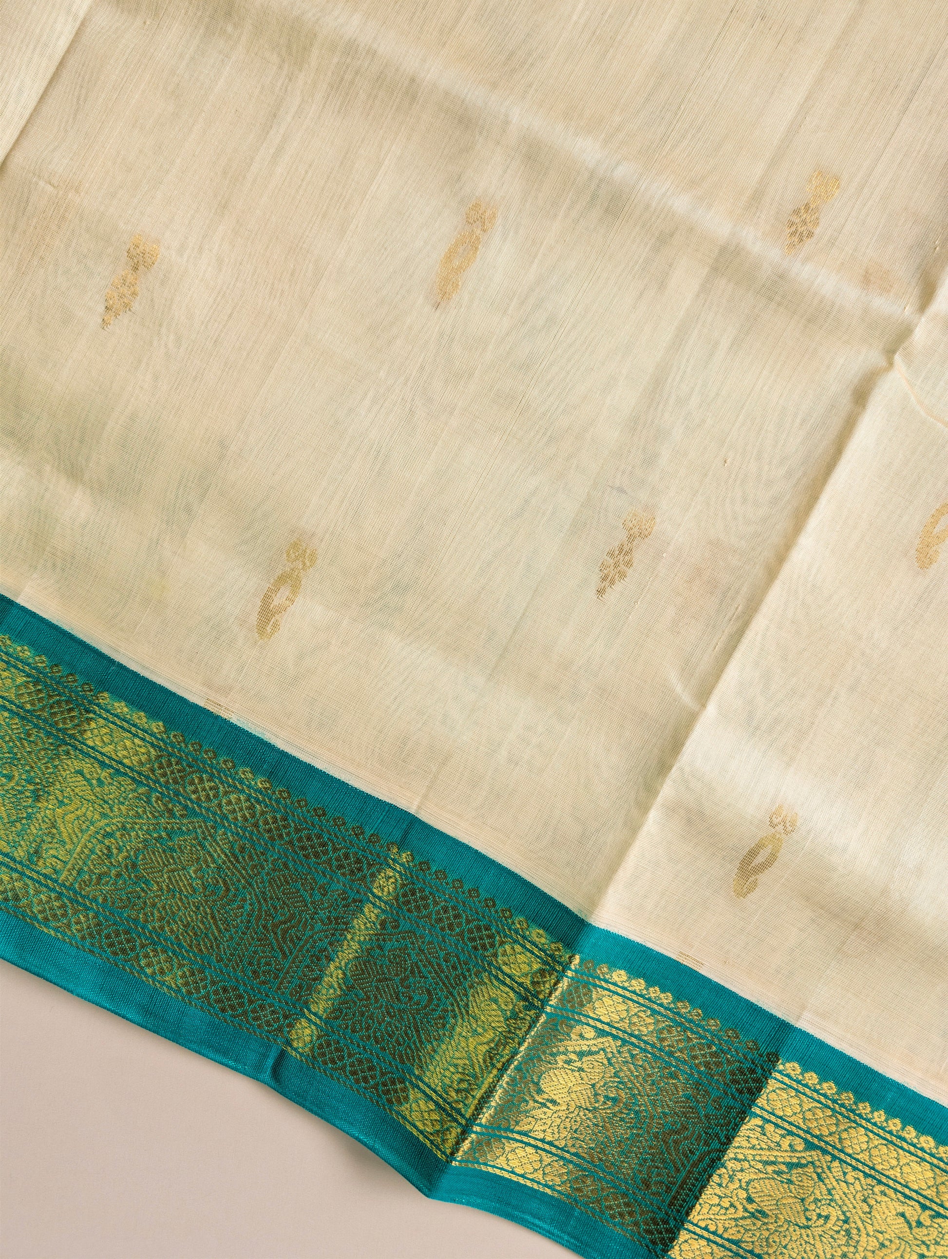 Off White and Cyan Koravi Pure Kanchi Silk Cotton
